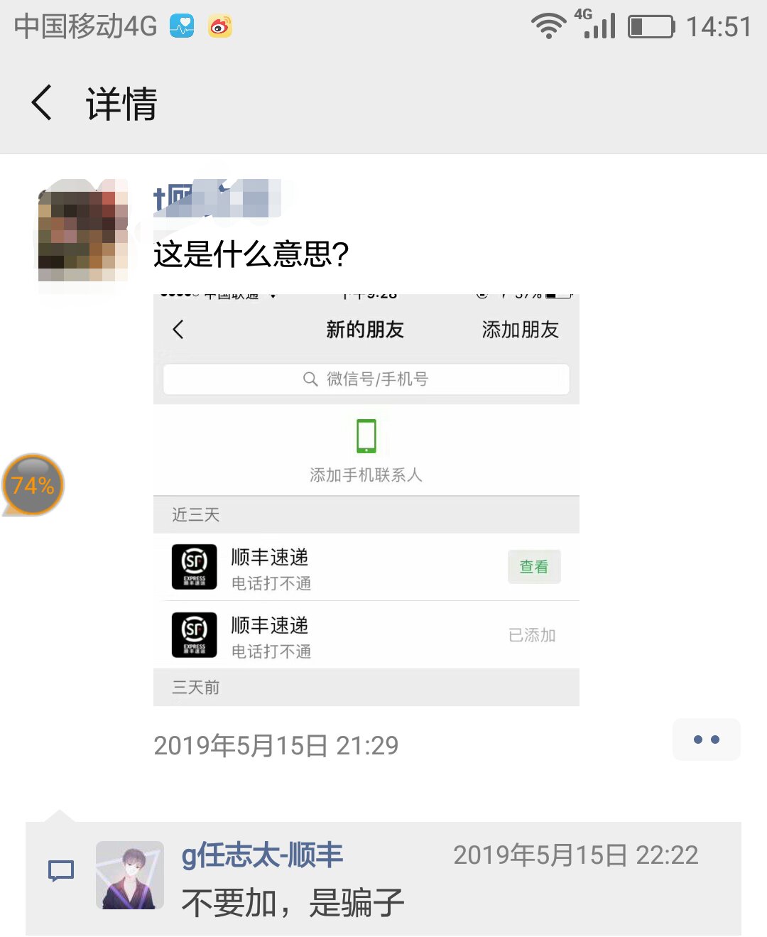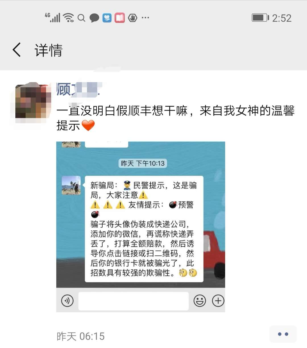小顧是我們專門負責發(fā)貨的同事,公司很多貨都是通過順豐來寄給客戶的,前兩天小顧碰到了順豐加她微信號的事,小顧覺得很不正常,截圖發(fā)了萬能的朋友圈,和我們對接的順豐人員評論說是騙子,不要加。后來又有朋友提醒她騙子加她微信的目的,終于明白了假順豐的用意。假順豐正是利用大家對順豐的認可和信任,來欺騙廣大的順豐客戶,這種行為也給順豐造成了傷害。